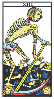 El Arcano XIII aparece para eliminar cuanto tenemos y obligarnos a reconstruir nuestra realidad. Como en un proceso alquímico, hemos de eliminar de nuestro mundo todo aquello a lo que estamos apegados y descubrir quienes somos realmente. Atrás queda un tiempo en el cual avanzamos con ilusión por realizar cosas nuevas; posteriormente nos implicamos emocionalmente e ideamos las mejores fórmulas para compartirlas. Ahora, el Arcano XIII, nos enseña que hay que trascenderlo para evitar vivir apegados a situaciones que nos impiden avanzar a causa del encasillamiento que produce la atracción hacia lo creado.